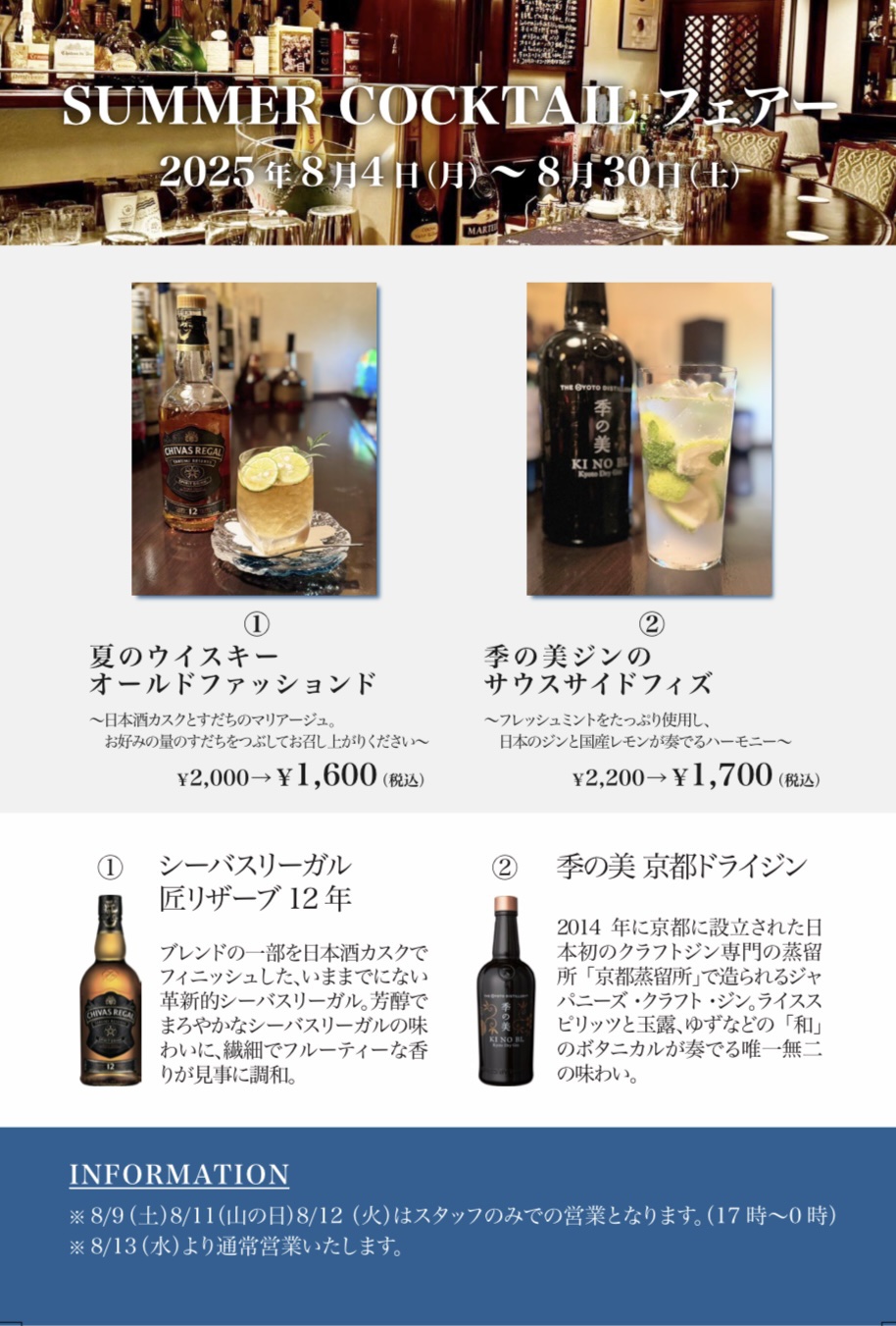 8/9(土). 8/11(山の日). 8/12(火)は営業はしておりますが、スタッフのみでの営業となります(17時〜0時まで)。